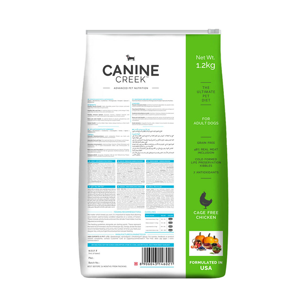 Canine Creek Ultra Premium Adult Dog Food is a life-preservative and grain-free formula. It is enhanced with 7 antioxidants – Apples, Blackberries, Cranberries, Pomegranate, Pumpkin, Spinach, and Blueberries. Canine Creek food is also a manufacturing breakthrough because it is “cold-formed” to minimize the heat the ingredients are exposed to minimizing heat exposure is important because high heat can degrade the potency of many vitamins, minerals, antioxidants, and important enzymes.