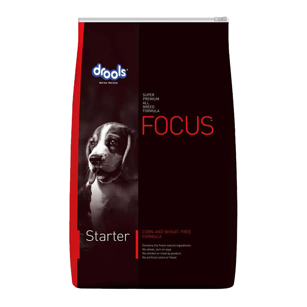 Drools Focus Starter Super Premium Dog Food is a corn, soya, and wheat free, all breed formula, specially designed for weaning puppies from 3 weeks to 3 months who require an increased amount of protein, energy and essential nutrients and are on a gluten free diet. As with all products of this range the FOCUS is on more meat, but is also enriched with natural antioxidants, prebiotics, probiotics and omega fatty acids for better gut health, digestion and absorption which support the overall growth and development of puppies after weaning. Also, ideal for lactating dogs, as the essential nutrients helps in both fetal development and milk production.