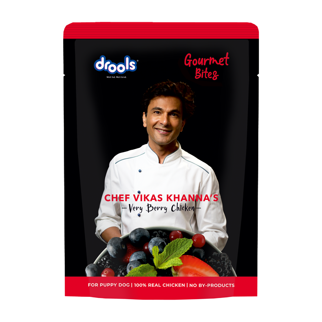Your puppy will love every chunk of the Drools Gourmet Bites Puppy Gravy thoughtfully crafted by Chef Vikas Khanna. This farm fresh recipe starts with Real Chicken mixed with a healthy blend of superfoods such as cranberries, blueberries, raspberries and strawberries that are loaded with the goodness of antioxidants to make your puppy thrive. This gravy can be mixed with dry kibble to add variety or served on its own. Formulated with Omega 3 & 6 fatty acids this recipe supports brain, eye and cognitive development, and enhances a shiny, healthy coat.