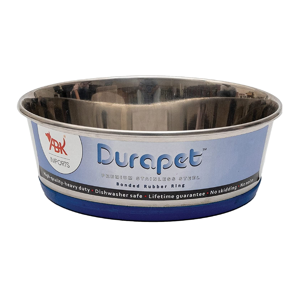 A tough rubber ring keeps the Durapet Stainless Steel Bowl firmly in place while your dog enjoys his meal. And it eliminates skidding and noise – so you can enjoy yours. Super durable and long lasting. Won’t harbor bacteria, more sanitary and hygienic than plastic bowls. Will not leach harmful plasticizers and colorants. Bonded rubber ring stays on the bowl and provides a secure grip. Dishwasher safe.