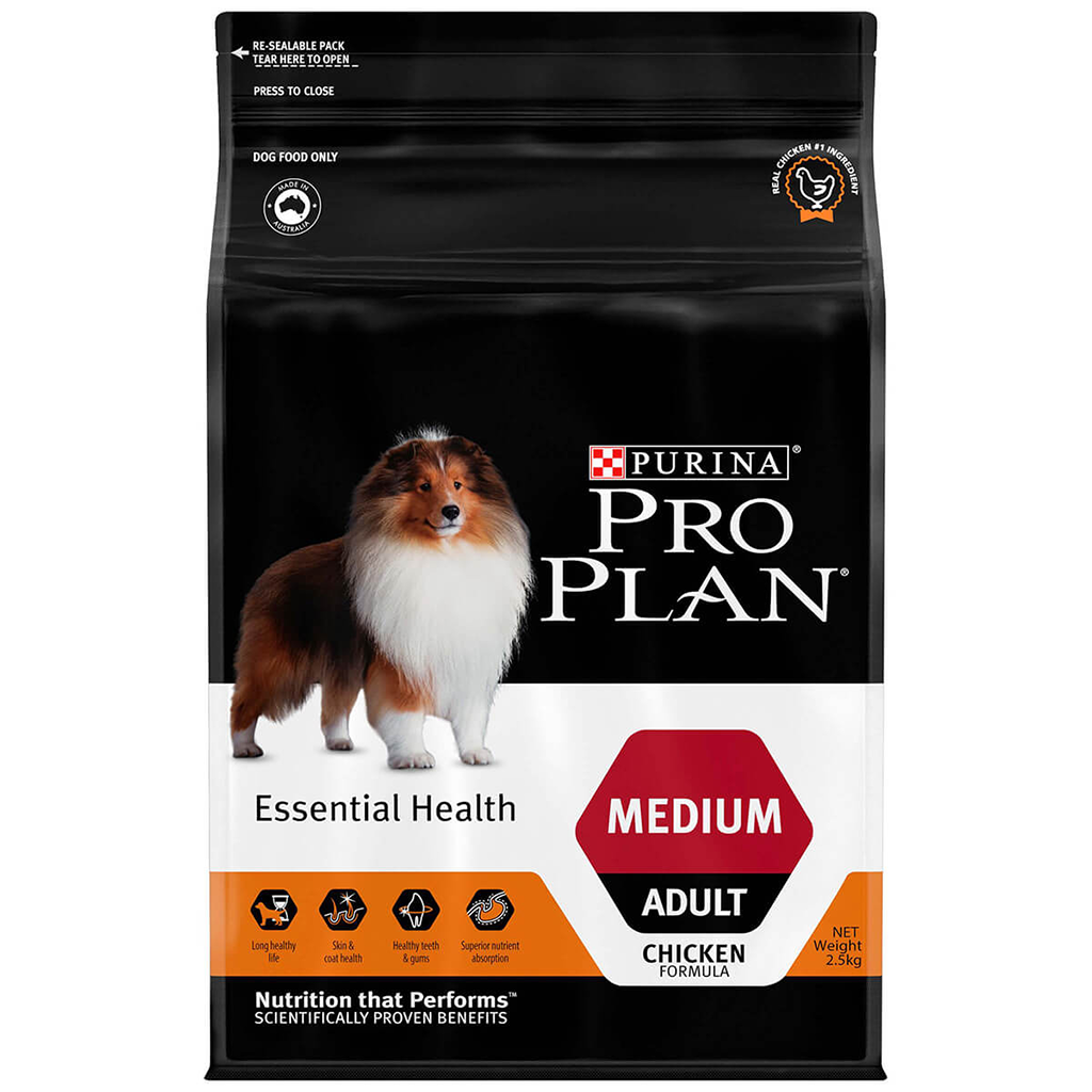 PRO PLAN Essential Health Medium Adult is a complete and balanced dry dog food for medium size adult dogs. Essential Health has been developed by vets and nutritionists at PURINA® to give your medium-sized breed dog the best nutrients for their health needs.