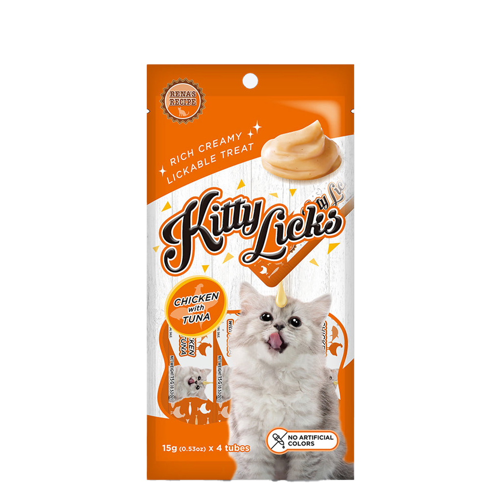 Rena's Recipe Kitty Licks Chicken With Tuna Kitten Treat for all breeds. Made in Thailand. Rich Creamy, Lickable Treat. Chicken with Tuna Flavor. No artificial colors used.